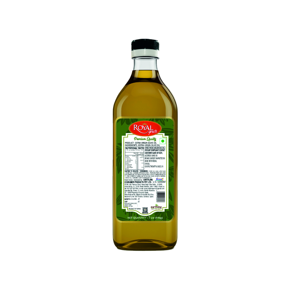 Packed in a convenient 1 litre bottle, Royal Grove Extra Virgin Olive Oil offers consistency, purity, and versatility for daily use. It is free from argemone oil and sourced from Spain, ensuring international quality standards and reliable performance in a wide range of recipes.